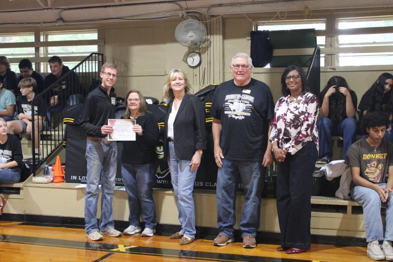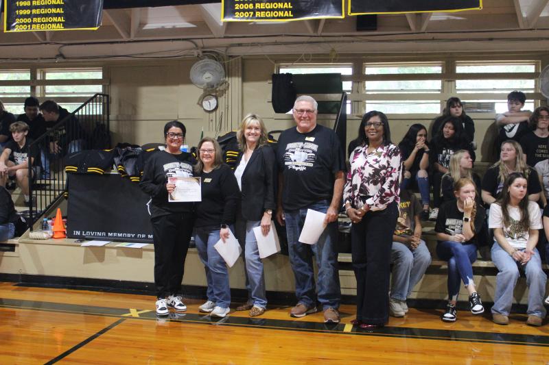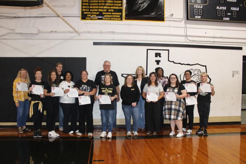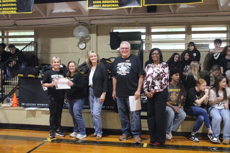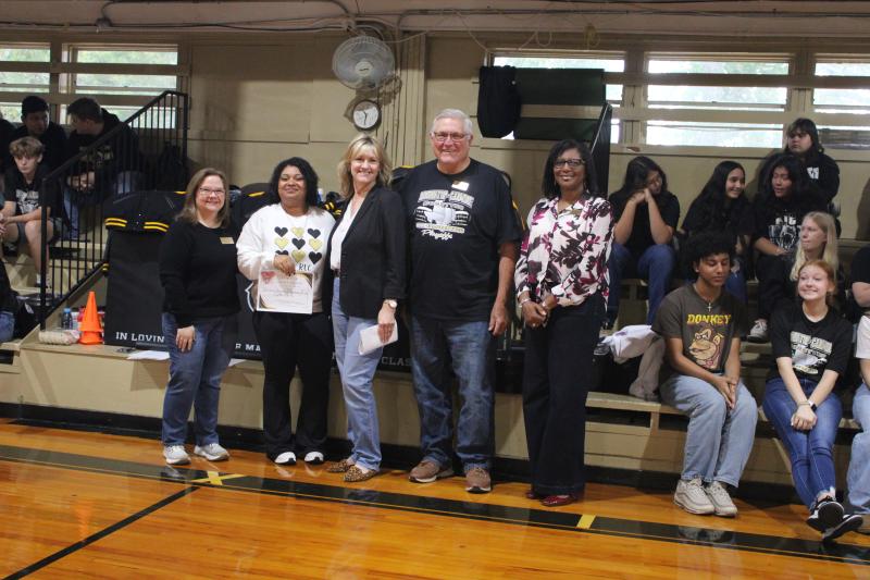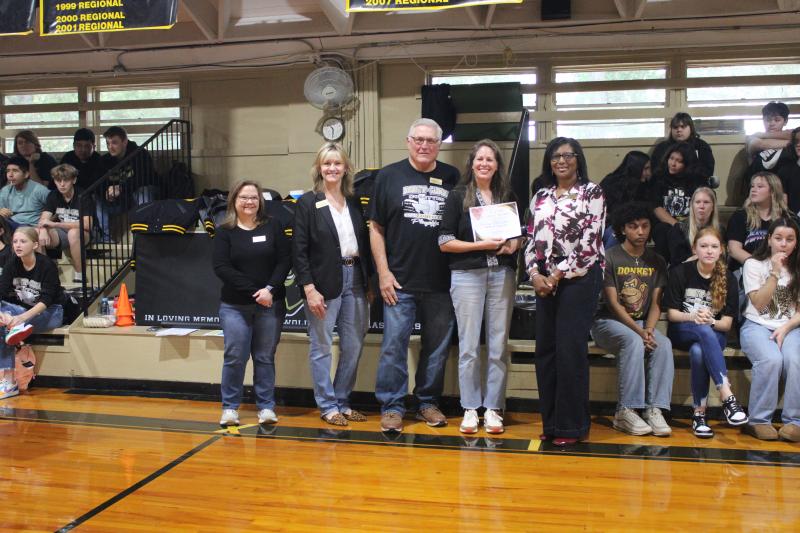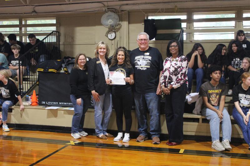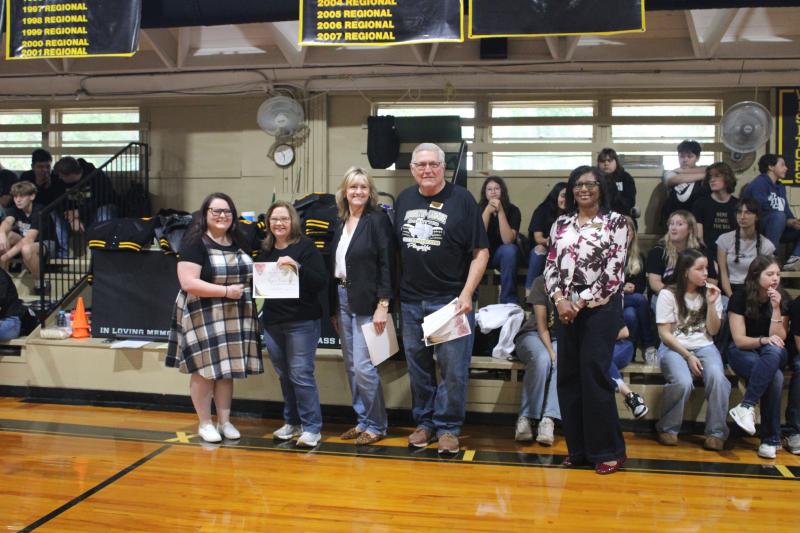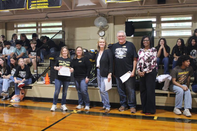 Our Teacher Grant Committee of Sherry Pennington, Kristi Wunderlich, and Jerry Schatte, along with Board President Ruby McCullough made presentations for 14 Innovative Teacher Grant Awards this morning at the District Pep Rally. 14 projects, curriculums, and field trips totaling over $ 9100 will be transform classrooms on both campuses. Congratulations, teachers! Your generosity helps us make these opportunities happen! #smallschoolbighearts