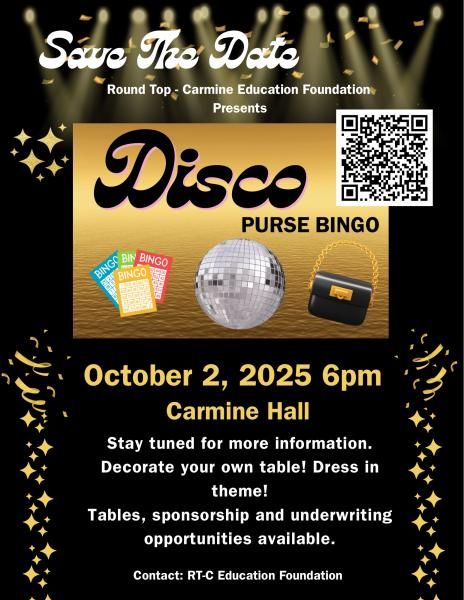 Join us for a fun-filled night of Disco Purse Bingo at Carmine Hall on Thursday, October 2nd! Our first-annual Disco Purse Bingo will benefit the programs of the Round Top-Carmine Education Foundation, while we have a disco-filled evening of wine, charcuterie, and bingo games! Designer Purses will be ready to be won during the evening. Get tickets for yourself or your table of 4 or 8 on our Event Tickets tab, or click here. Don't miss a great evening!